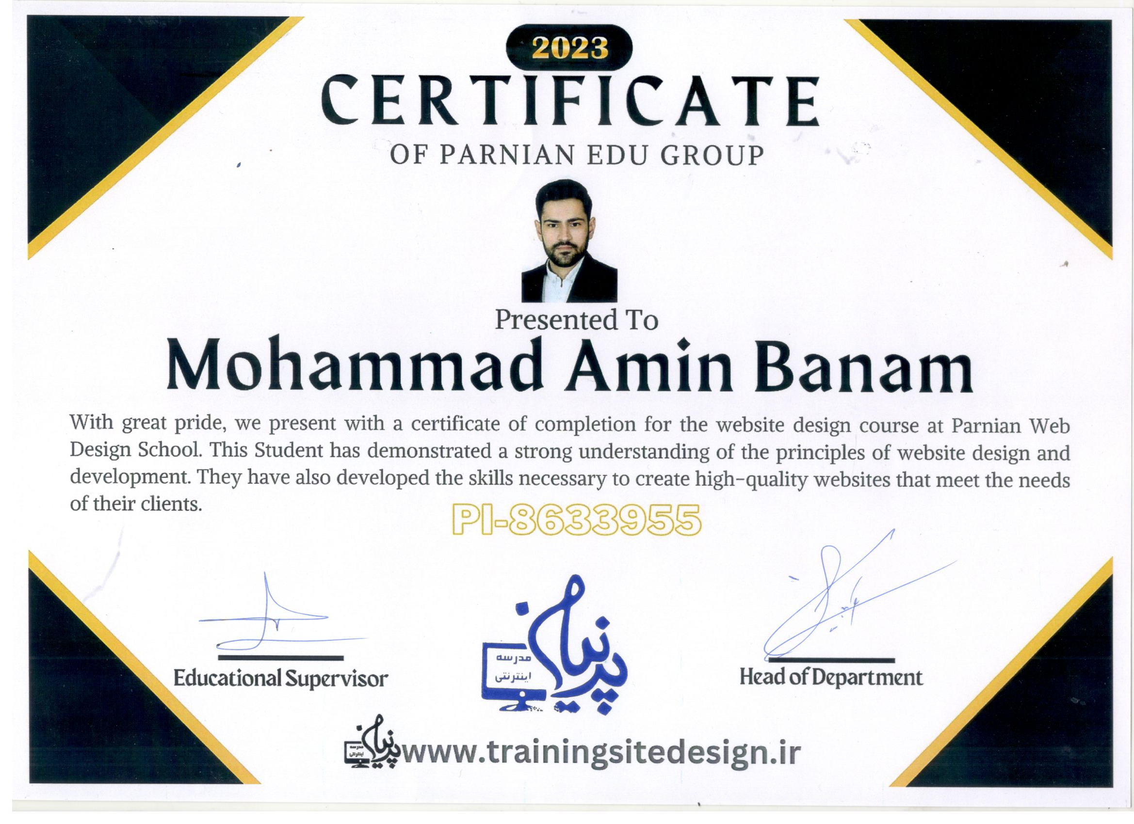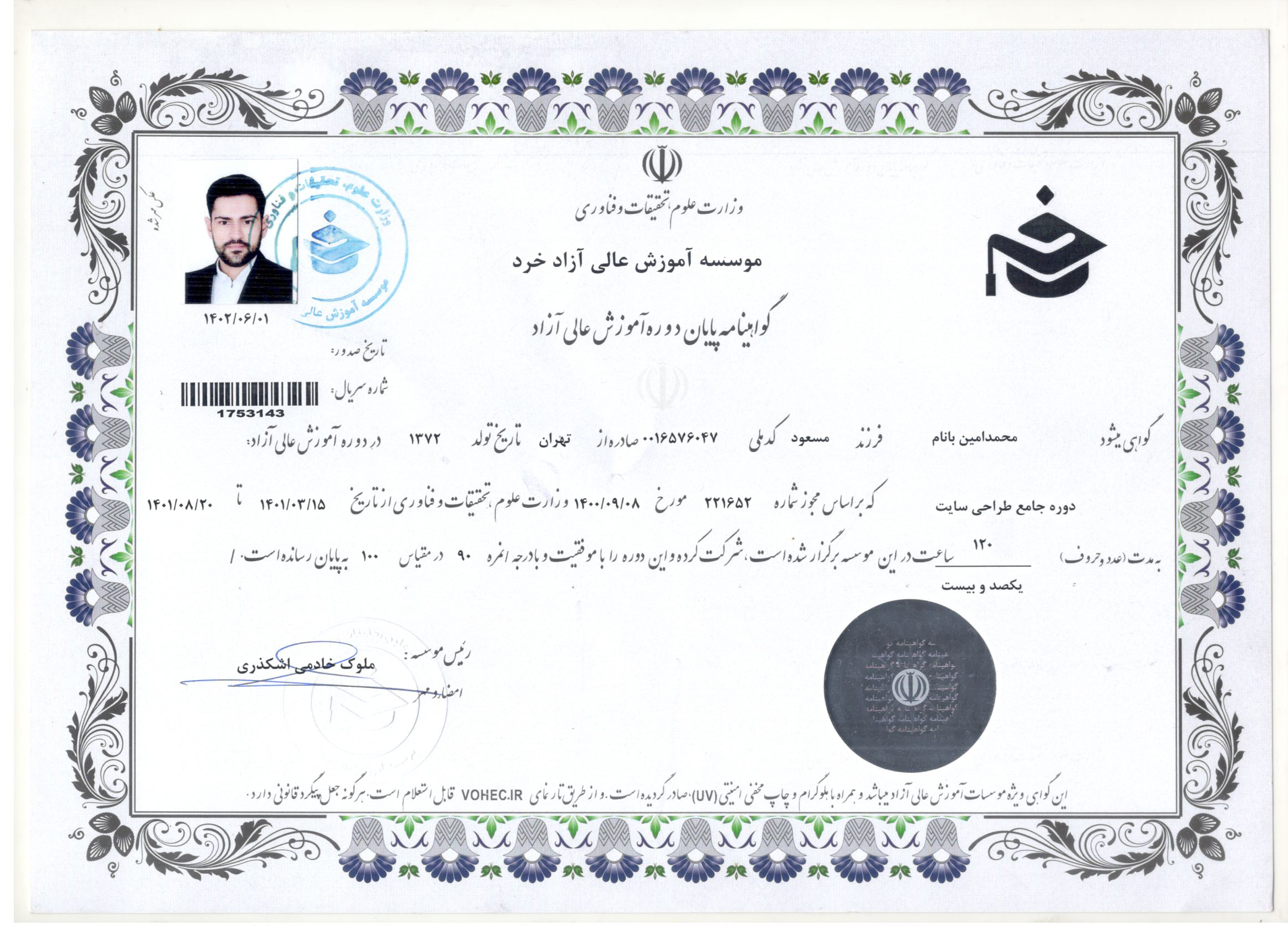 In the slider below are some of my certificates in the field of web and networking. I put a lot of time and effort into these fields. I took computer networking courses at Tehran Technical Complex for two years and took web courses at Parnian School with Engineer Parsa Ghorbanian. I have a master's degree in IT management and a bachelor's degree in IT engineering. I also have a military service certificate. Just click on the slider buttons.